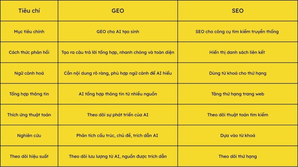 Khác biệt chính giữa GEO và SEO nằm ở cách mỗi thuật toán đánh trọng số các yếu tố và cách nội dung của bạn xuất hiện (hoặc không xuất hiện) trên từng công cụ.