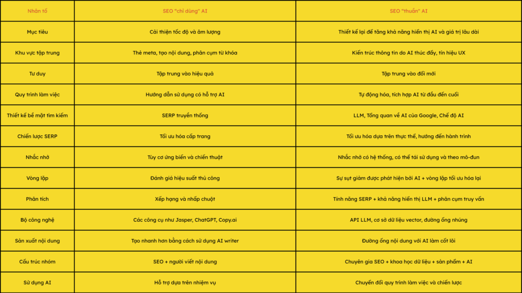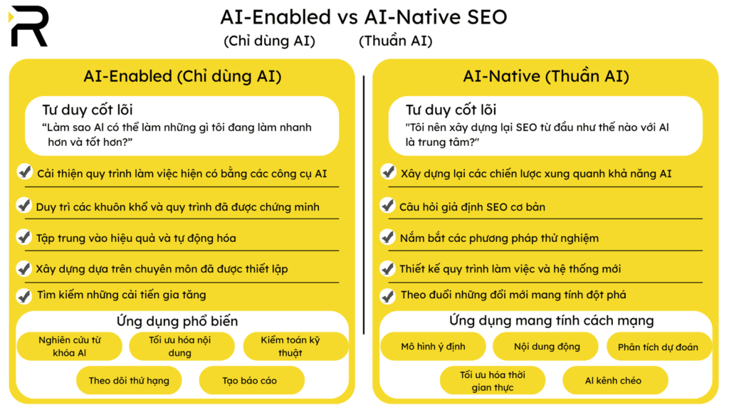Sự khác biệt giữa SEO “chỉ dùng AI” (AI-Enabled SEO) với SEO “thuần AI” (AI-native SEO